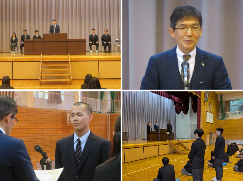 着任式では新たに7名の教職員を迎え、代表して平賀校長先生より着任の挨拶がありました。始業式の式辞では、「挨拶という魔法の言葉」の大切さや、「自己を見つめ直し、未来の軸をつくる年に」という力強い指針が示されました。その後の賞状授与式では男子バレーボール部の栄誉を称え、表彰を行いました。
