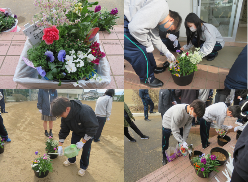 【行事報告】3年生美化活動・美花活動 投稿日時 : 01/30 sgym カテゴリ:学校行事 本校3年生が飛翔式(18歳成人)のスローガンとして「貢献報恩」を掲げています。 飛翔式に先立ち、1月14日(水)に匝瑳市内美化活動(ゴミ拾い)を行いました。 また、美花活動として花の寄せ植えを作成し、各中学校(母校)に届けました。 自分たちで花を選び、今後も地元へ貢献することを誓い感謝の気持ちとともに、楽しく活動をすることが出来ました。 Tweet