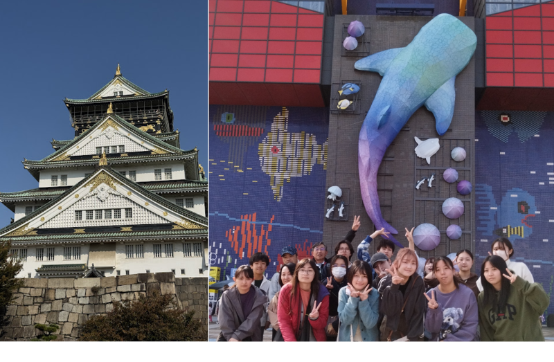 まず大阪城。皆、若さにものを言わせて階段で移動!若干ヒイヒイ言いつつ、展示をしっかりと見学していました。その後は海遊館を訪れ、迫力あるジンベイザメや多様な海の生き物たちの生態に触れ、ゆったりとした時間を過ごしていました。