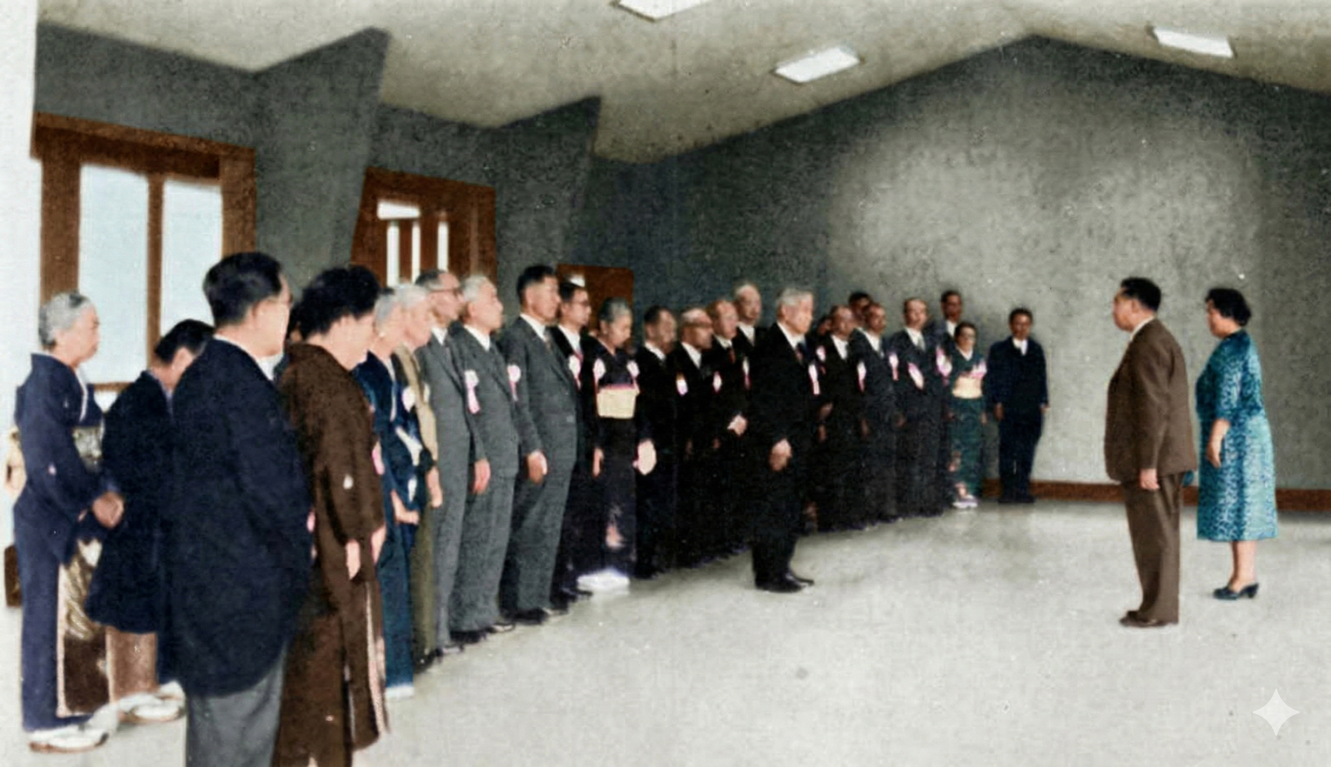 藍綬褒章受章の様子。代表して天皇皇后両陛下に御礼を言上している。(1959年(昭和34年)5月)